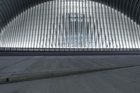 This is an image of a modern architectural structure in the city of New York, USA. The building's facade showcases a symmetrical design with clean lines and a futuristic appearance. At night, the artificial lights illuminate the open space around the structure, creating a striking contrast against the dark sky. The steel and metal elements of the building's roof and profile add to its urban and modern aesthetic. This photo captures the essence of the architectural beauty and innovation found in Manhattan's skyline.