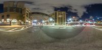 Night time in Manhattan, the heart of New York City. Dimly lit streets showcase the modern architecture of the city. Empty cars line the road, contrasting with the artificial light from street lamps and buildings.