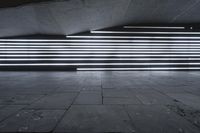 Nighttime in Manhattan, New York. Modern architecture and urban infrastructure create a monochromatic atmosphere. Light streaks and motion blur highlight the city's bustling energy. The concrete structures and artificial light contribute to the city's iconic profile.