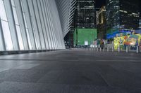 an empty sidewalk with many benches and some skyscrapers in the background at nighttime