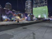 A captivating night view of Manhattan, New York. Skyscrapers dominate the cityscape while a vibrant graffiti wall adds urban artistry. The illuminated streets and concrete infrastructure create a metropolis full of energy.