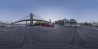 a circular view of boats parked at pier in urban area next to a bridge and building