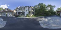 a view of a driveway and side walk in front of a mansion with lots of trees
