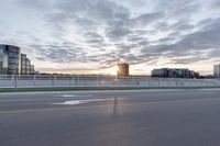 A view of a low-lying road in Markham, Ontario at dawn. The road stretches across the landscape, lined with a guard rail. The city skyline can be seen in the distance, contrasting with the serene ocean. A snapshot of urban infrastructure in Canada.