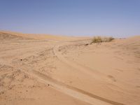 A breathtaking view of the Sahara desert in Morocco. The vast open space is dominated by towering sand dunes, creating a mesmerizing landscape. Clear skies and the warm sun add to the allure of this off-road paradise.