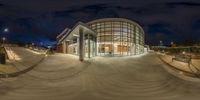 The Martin Center, a modern architectural marvel in East Tennessee. The concrete facade and glass entrance create a striking contrast against the clear night sky. The composite material flooring and elevated urban design make it a standout in the bustling business district.