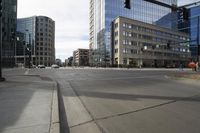 This is an image of a modern cityscape with a view of a downtown area. The architecture of the buildings in this metropolitan area features sleek and modern designs. The road and crosswalk are made of concrete and asphalt. Open spaces can be seen throughout the residential areas, providing a pleasant environment for the neighborhood. The infrastructure supports the efficient transportation system of the city. The clear sky above is adorned with contrails, indicating the bustling activity in the urban metropolis. This photo captures the energy and vibrancy of city life.