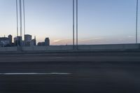 A calm evening in a metropolis, with the sun visible on the horizon. The urban skyline, dominated by high-rise skyscrapers and a parallel bridge, creates a stunning composite material. The clear sky and motion blur of cars on the highway add a touch of serenity to the bustling city.