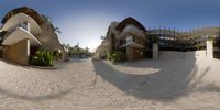 A modern architecture residential building in Solidaridad, Mexico. Surrounded by lush vegetation, the building's facade is highlighted by sunlight. The open space features a walkway, courtyard, and a surfboard in the yard.