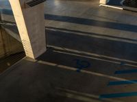 the parking space of a street corner with blue paint on it's asphalt floor