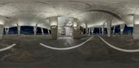 A circular room in Miami Beach, USA, with white lines painted on the walls and pillars. The artificial light creates a dark and mysterious atmosphere. Straight down the road, the parking lot offers an open space.