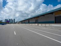 A road in Miami Beach, Florida, lined with asphalt and surrounded by loading docks. Clear day with clouds in the sky. A typical scene in the bustling city of Miami.
