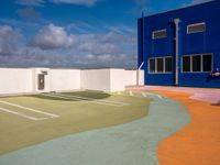 This is an image of an empty tennis court outside a building in Florida City, USA. The urban landscape features a concrete surface, skyscrapers, and the Miami skyline in the background. The clear sky with fluffy clouds contrasts with the urban design of the city. The parking lot on the rooftop provides ample space for vehicles. This photo represents the city life of Miami Beach, where art districts and skyscrapers dominate the cityscape.