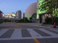 Empty intersection in Miami Beach, Florida, illuminated by a large green glass dome. Modern architecture and neon lights create a vibrant cityscape. The clear sky represents the break of day in this urban art district.