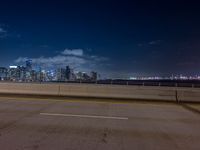 This photo captures the vibrant cityscape of Miami, Florida, USA at night. The image features an empty street with a bridge in the foreground and the city skyline in the background. The dark night sky contrasts with the illuminated skyscrapers, creating a captivating urban design. The coastal location of Miami Beach is visible, with the ocean and water adding to the scenic beauty of the scene. This photo represents the urban atmosphere and architectural marvels of the city of Miami.