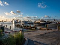 The sun is rising over boats docked near the pier on a clear day in Miami Beach, Florida. The blue skies and fluffy clouds create a picturesque coastal scene. The hard shadows and urban design of the city contrast with the calm water surface of the ocean. This serene coastal landscape captures the beauty of Miami's coastline at the break of day.