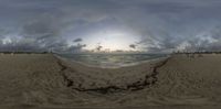 the sea on a sandy beach is shown in this fish - eye lens image,