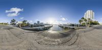A stunning fisheye lens photo capturing the beauty of Miami Beach's coastal landscape. Boats docked at the pier with the city skyline in the background. The clear blue sky and sunshine create a perfect day for water activities.