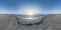 the view from inside a fish eye lens of the ocean in the distance, as people are walking along the shoreline
