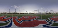 A sunny day in Miami Beach, Florida at the iconic stadium. The field is adorned with painted letters, creating a vibrant atmosphere for football and soccer. Palm trees add a touch of greenery to the scene.