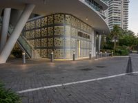 Modern architecture in the heart of Miami Beach. The city comes to life as the dawn breaks, with artificial lights illuminating the urban landscape. Residential and commercial buildings stand tall against a cloud-filled sky.