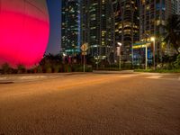 empty city street in front of brightly colored building at night time on beachfront with large pink ball