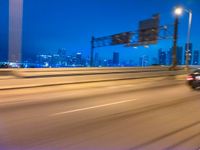 A motion blur of Miami's urban cityscape at night, with artificial lights illuminating the gloomy streets. The train passing by near a street light adds a sense of movement. Grey sky adds to the overall ambiance.
