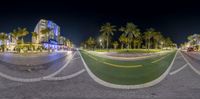 this is a 360 - view panoramic shot of an intersection at night with palm trees in the background