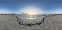 a panoramic photo of a beach and ocean at sunset with people walking on the sandy sand
