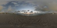 the view from a panoramic angle shows the sand and water at the beach with a beach umbrellas in the foreground