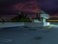 This image captures an empty parking lot on top of a building in the middle of Miami, Florida. The gloomy and dark atmosphere is accentuated by the grey sky and artificial streetlighting. Shadows cast by the streetlights create hard shadows on the concrete surface. The break of dawn is indicated by the softening of the sky, but the artificial lights still illuminate the scene. This photo represents the urban landscape of Miami at night, depicting the contrast between the dark shadows and the artificial light.