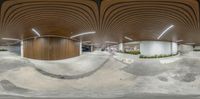 At night in Miami Beach, an artfully lit parking garage with circular walls and ceilings. Neon lights illuminate the skateboard ramp in the center, creating a striking profile against the dark sky.