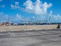 An open parking lot in Miami Beach, Florida, with cranes in the distance. The clear sky sets the stage for a sunny day. The asphalt surface provides ample space for parking.