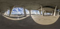 a photo looking in from the floor at an empty skate park or skating court with concrete columns and pillars