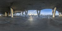 A fisheye view of an empty parking lot in Miami, Florida. The skyline of Miami Beach and skyscrapers create a dramatic cityscape. The concrete surface reflects the bright sunshine, casting hard shadows. Elevated and top-down view of the road and open space.