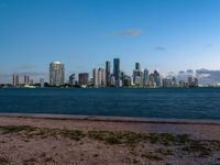 This image captures the serene beauty of a coastal city at dawn in Miami Beach, Florida. The cityscape showcases the urban design and the vibrant city life of Miami. The sun rises over the ocean, illuminating the sandy coastline and the sparkling water. The clear sky is decorated with fluffy clouds, providing a picturesque backdrop. The shot highlights the contrast between the urban landscape and the natural elements of water and sand. This photo captures the essence of Miami's coastal beauty and its unique blend of urban and natural surroundings.
