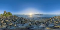 a panoramic photo of a beautiful sunrise over the water, with rocks and trees