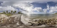 a panoramic view of the water and sand on a beach with rocks, grass, and coconut trees