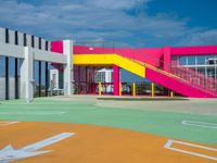 baseball field at school with brightly colored building behind it and stairs leading to each one
