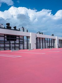 the empty tennis court is lined with different courts and markings of players on it and on the roof are red asphalt