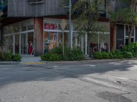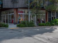 This is an image of a road in Miami Beach, Florida. The asphalt road is surrounded by urban buildings and storefronts. The clear sky above is dotted with clouds, casting hard shadows on the road and buildings. This scene captures the vibrant city life of Miami, with its bustling streets and urban design. It represents a typical day in Miami, where people can be seen shopping and enjoying the urban atmosphere. This photo showcases the unique charm and energy of Miami Beach.