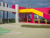 A view of the urban landscape of Miami Beach in Florida. The city's art district comes to life with vibrant colors and unique designs. The concrete surfaces contrast with the clear blue sky. A bustling city alive with urban design.