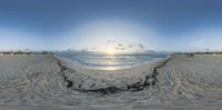 a 360 - view fish eye lens looking at people walking on the beach at sunset