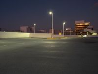 an empty parking lot next to a city building at night with streetlights in the foreground