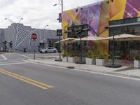 Gloomy day in Miami Beach's urban art district. Zebra-striped store stands out among parked vehicles. Grey sky sets the backdrop for a vibrant graffiti wall. An intriguing mix of urban design and city life.