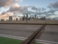 Aerial view at dawn of Miami Beach, Florida, with the city skyline and coastal highway. The overpass displays vibrant green markings adding to the urban design. Coastal scenery overlooks the sparkling ocean.