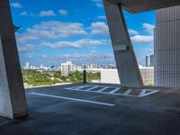 This is an image of a cityscape in Miami, Florida. The photo captures the vibrant urban atmosphere with a clear sky and a skyline dominated by skyscrapers. The concrete surfaces and parking lots add to the city's modern aesthetic. In the foreground, a person can be seen walking down the sidewalk, adding a human element to the scene. This photo represents the bustling energy and architectural beauty of Miami.