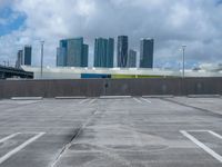 Empty parking lot in the heart of Miami. Surrounded by towering office buildings, this urban space showcases the city's modern design. A clear day highlights the cityscape and the cloudless sky.