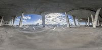 An elevated view of Miami's cityscape from the center of a parking garage. The fish eye lens captures the straight road leading to the urban skyline. The concrete surface reflects the sunny sky, creating a hard shadow.
