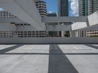 a white cement parking lot with skyscrapers in the background against a blue sky overhead